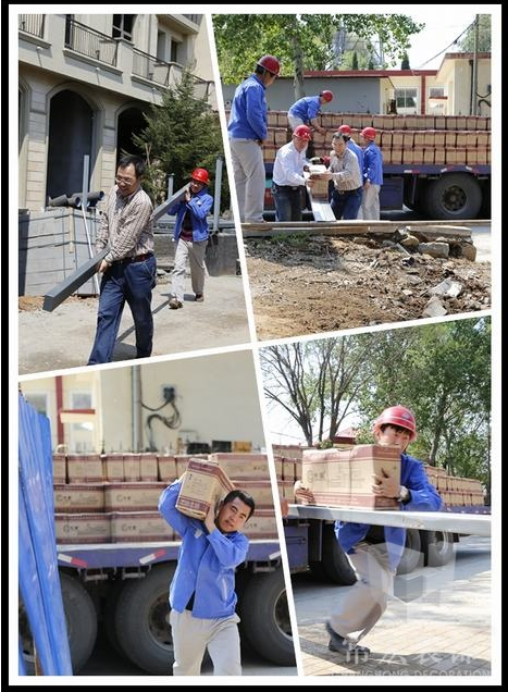 地面鋪裝的磚到現(xiàn)場,一箱80多斤,一共700多件。裝修工們二話不說,甩開膀子全部行動,熱火朝天的搬了起來!