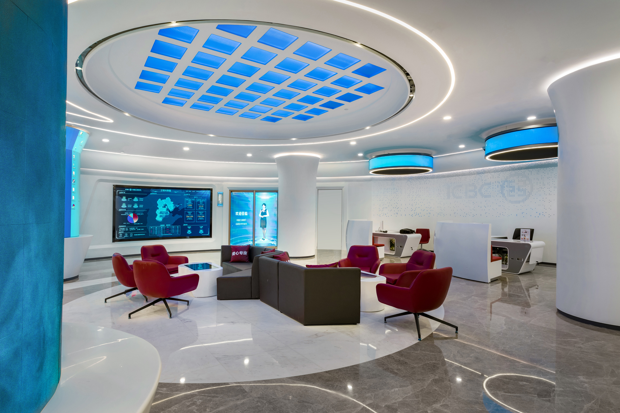 近日,由常宏提供設計服務的中國工商銀行河北分行首家5G技術智慧銀行骨干網點——石家莊中華支行營業(yè)室正式亮相。重裝開業(yè)的中華支行營業(yè)室運用大數據、物聯(lián)網、人工智能、生物識別、5G等前沿科技,將金融、社交、生活等場景相連接,為客戶提供多渠道、全方位的服務和智能化、個性化的消費體驗。