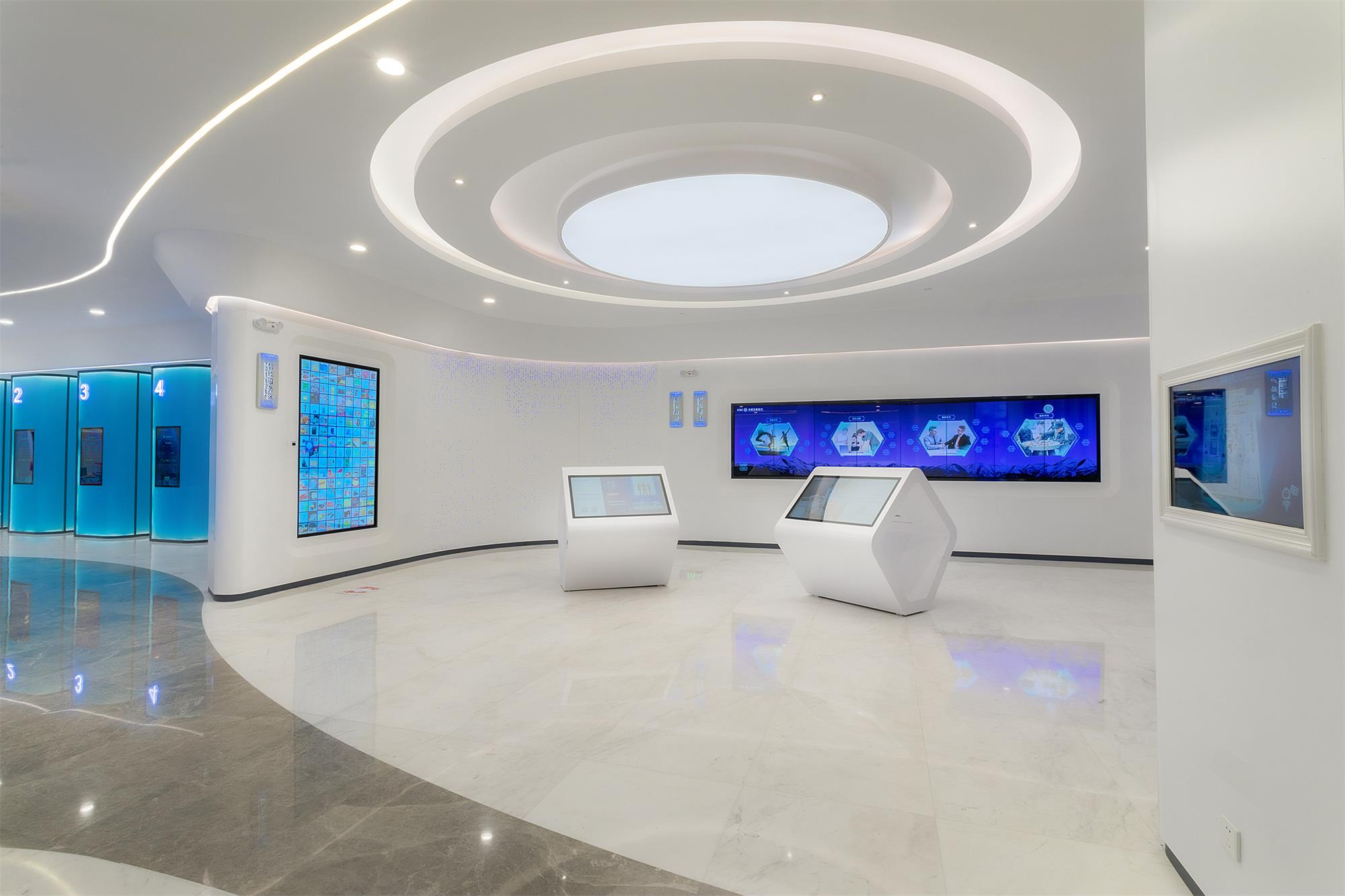 廳堂內(nèi)明亮的光線,流動(dòng)的波紋和多變的色彩,傳遞著穿越時(shí)空的設(shè)計(jì)語言,寓意時(shí)光的流逝、演變和發(fā)展;燈光和光帶如陽光一般從建筑的外立面延伸到室內(nèi)空間,與設(shè)計(jì)主題相呼應(yīng);智能區(qū)屏幕上疾馳而過的復(fù)興號(hào),講述著石家莊——火車?yán)瓉淼某鞘械陌l(fā)展故事。冀州古鼎、定州瓷器、蔚縣剪紙等擺件及飾品,描述著“京畿福地,大美燕趙”的宏偉畫卷。