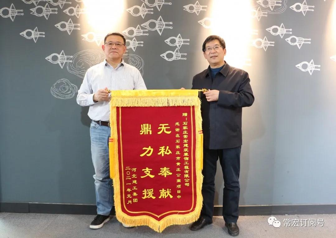 河北建工集團董事長李云霄(右)向常宏董事總經(jīng)理王躍(左)贈予錦旗